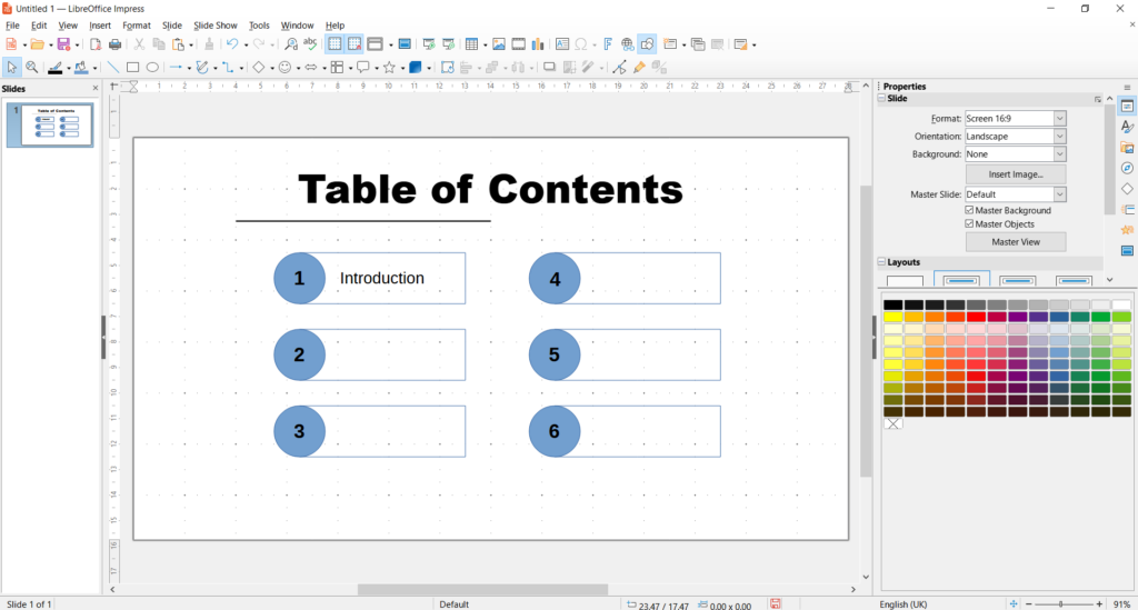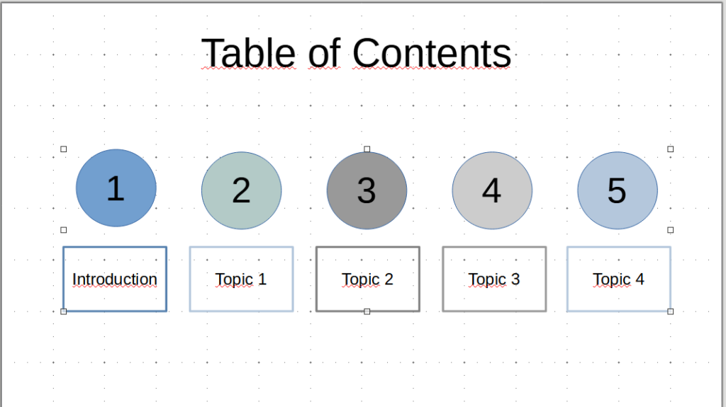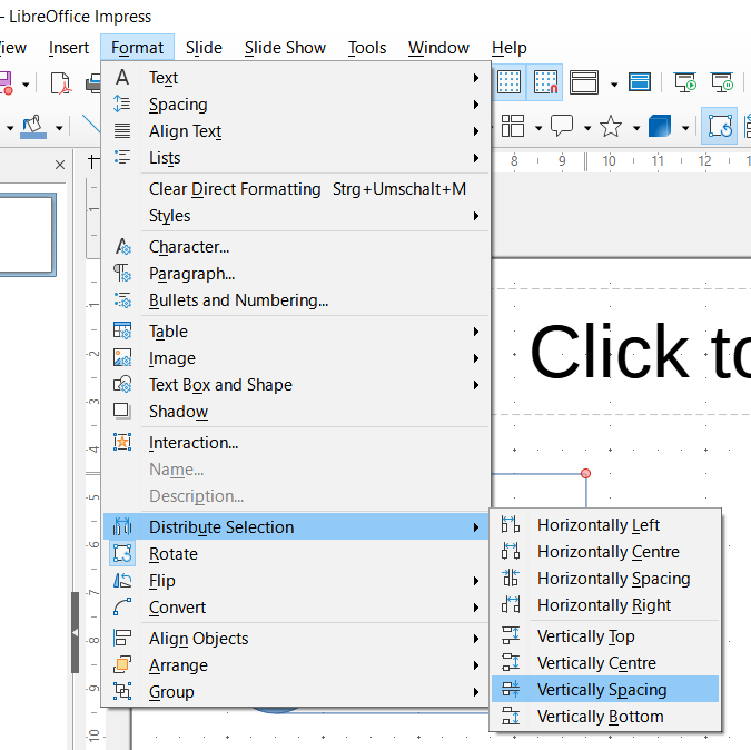 The elements are now distributed among themselves on the slide in an unstructured manner. Select all three and click on the “Align Objects” icon at the top of the bar. You can find it to the left of “Arrangement” or under the Format | Align Objects.