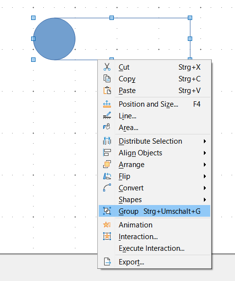 Click on the circle, hold down the Shift key and click on the rectangle. Now you have selected both objects. Using the right mouse button or the shortcut (Ctrl+Shift+G) you can now group the two elements. Now you can move both elements at the same time. Try it out.