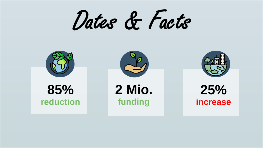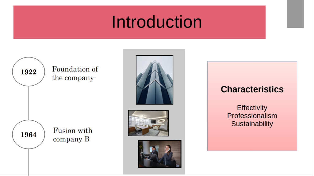 Links are e.g. different types of information packed on one slide. The gray box in the middle clearly separates the images from the other information. The pink box on the right offers more information and on the left you can see a timeline that will be discussed in more detail in the next chapter. This box division is also particularly good for comparisons such as comparisons, pro-contra lists, but also for diagrams and their explanatory information.