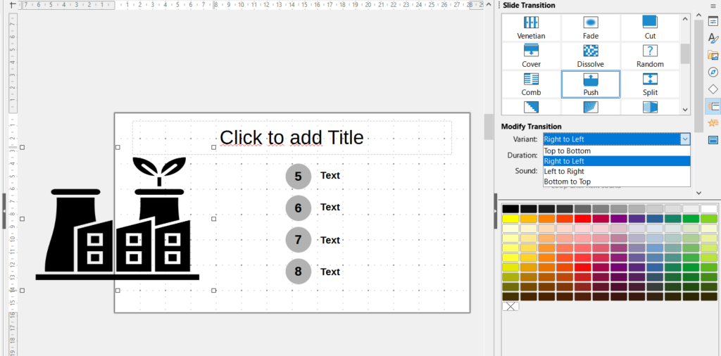 To add the animation, click on the second (!) Slide and select the Slide Transitions icon on the right.