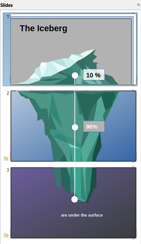 In this lesson, you learned the technique using the iceberg example. However, the design is also applicable to other scenarios and styles. However, it is important that the image is of high quality enough that it can be split over two or three slides.