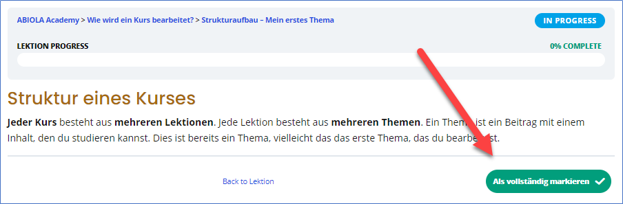 Jeder Kurs besteht aus mehreren Lektionen. Jede Lektion besteht aus mehreren Themen. Ein Thema ist ein Beitrag mit einem Inhalt, den du studieren kannst. Dies ist bereits ein Thema, vielleicht ist das das erste Thema, das du bearbeitest.