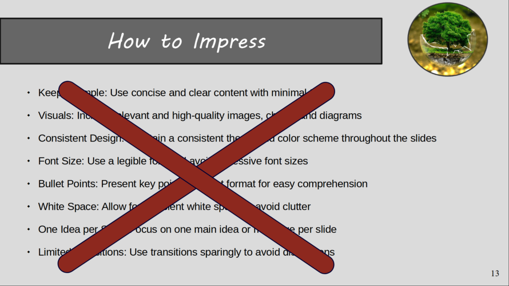 Während das gesprochene Wort Deinen Verstand und Rationalität anspricht, adressiert eine visuelle orientierte Präsentation Deine emotionale und kreative Seite. Wenn Präsentationen richtig verwendet werden, können wir Menschen auf verschiedenen Ebenen ansprechen und erreichen. Und die Zuhörer lauschen Deinen Worten anstatt sich im Text der Präsentation zu verlieren.