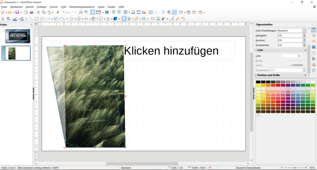 Wähle ein Rechteck aus und positioniere es so, dass es die ganze Größe der Folie überdeckt. Dieses Rechteck wird uns als Hintergrund dienen. Wähle nun eine dezente Farbe für aus, die sich gut im Hintergrund macht. Klicke unter Properties | Line | Line das leere Feld bzw. keine an und setze das Rechteck in den Hintergrund.