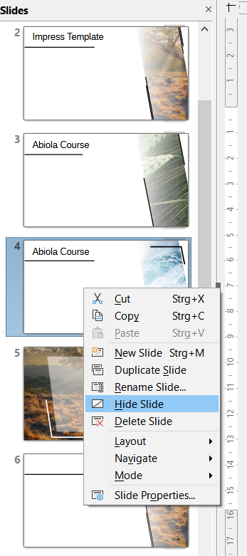 Um eine Folie auszublenden, klicke mit der rechten Maustaste auf die gewünschte Folie. Wähle im Dropdown Menü “Hide Slide” aus.