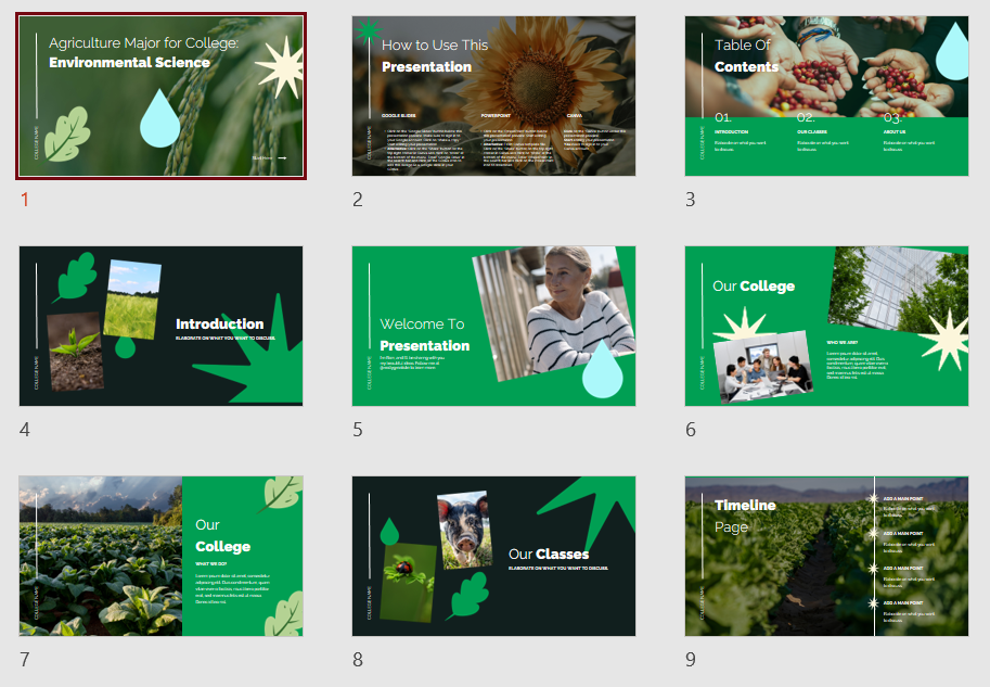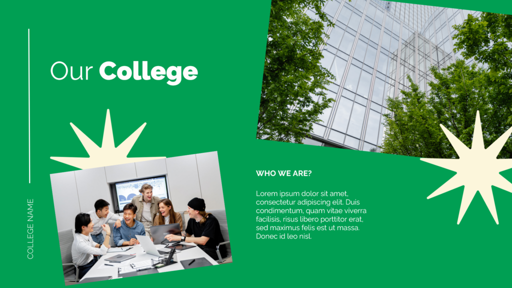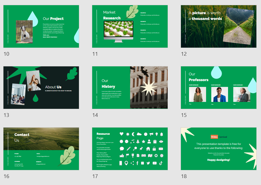 Das Design hat eine klare Struktur und Farbwahl. Die Farbwahl besteht aus einem kräftigen Grün- und Schwarzton. Zur Auflockerung sind stets Photos und wiederkehrende Icons eingefügt. Einige Photos dominieren mit klaren Linien den Hintergrund, zusätzliche Photos sind kleiner und stets gedreht und lockern damit die Folien auf. An der linken Seite ist zudem auf jeder Folie eine Line mit Raum um den College Namen einzufügen. Das ist eine schöne Art das Template zu personalisieren und professioneller wirken zu lassen.