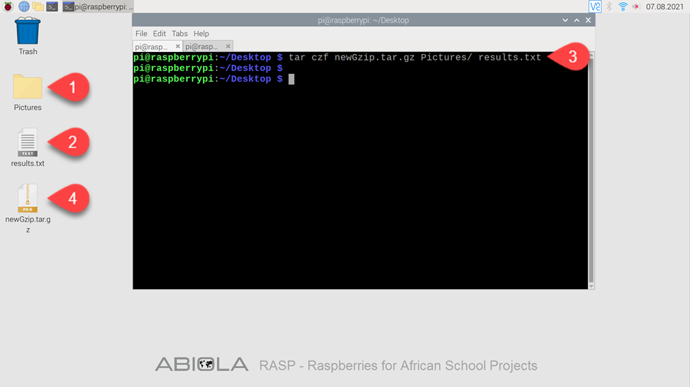 tar czf newGzip.tar.gz Pictures/ results.txt