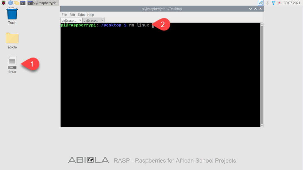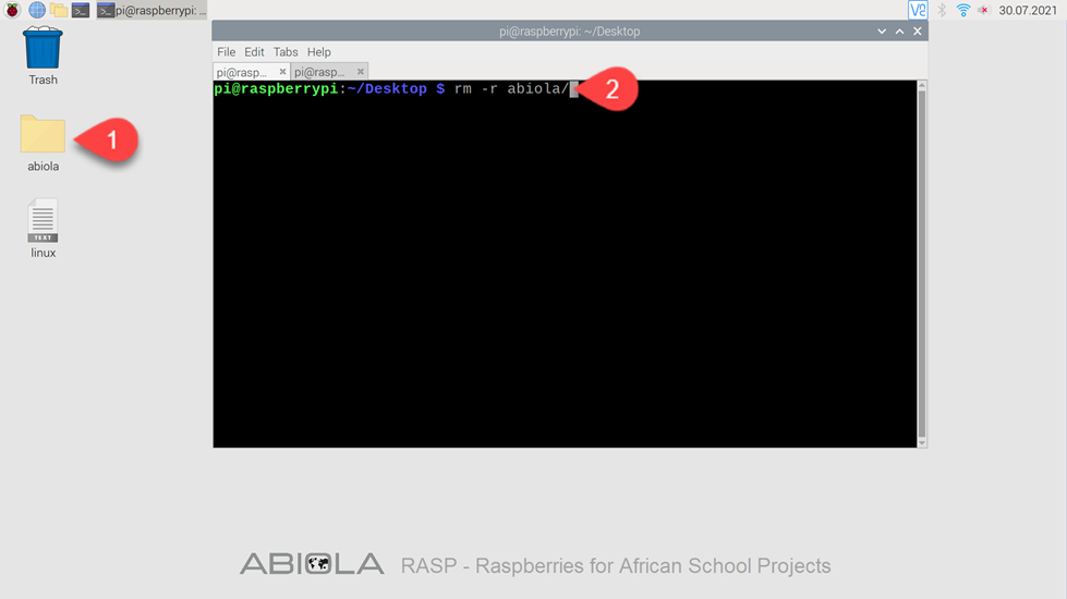 Der -r Befehl steht für “recursively” und wird verwendet, um Verzeichnisse zu löschen. Das erstellte Verzeichnis namens abiola auf dem Desktop können wir nun mit -r wieder entfernen.