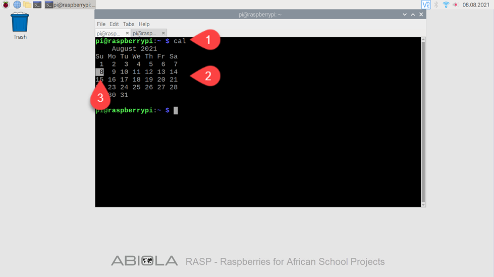 Noch ein simpler Befehl ist: cal Der Befehl cal zeigt den Kalender des aktuellen Monats an.