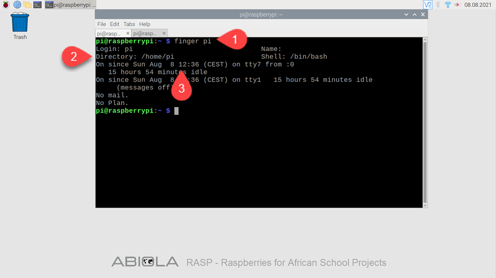 - Gib anschließend den folgenden Befehl ein, um Informationen über den Benutzer pi zu erhalten.