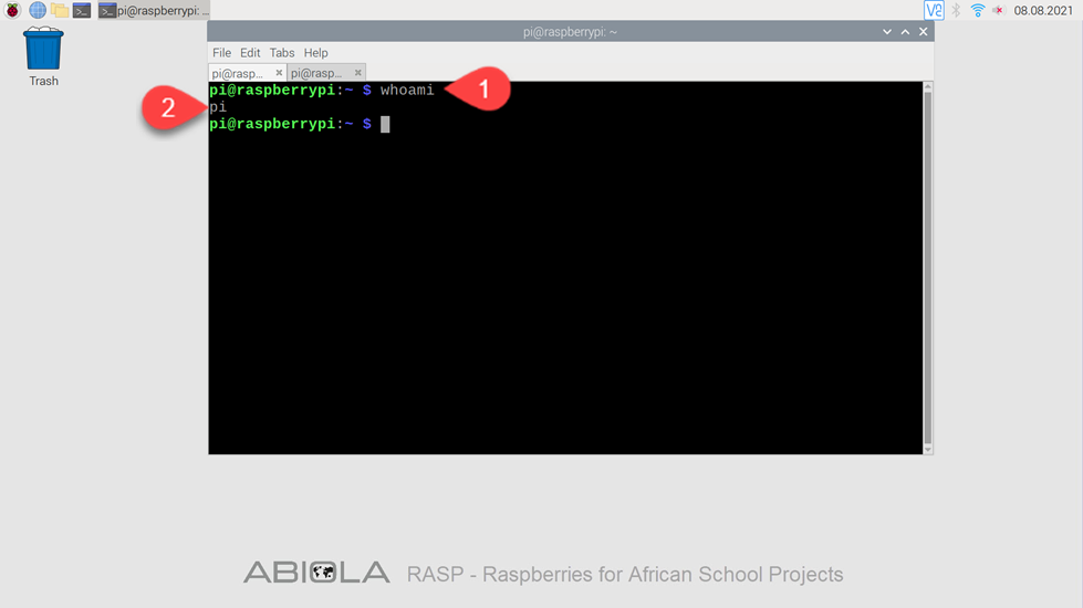 Der Befehl whoami gibt die aktuelle Benutzer-ID aus. Ein Raspberry Pi kann von mehreren Benutzern mit unterschiedlicher Benutzer-IDs verwendet werden. Mit whoami kannst Du prüfen, welche Benutzer-ID aktuell verwendet wird.