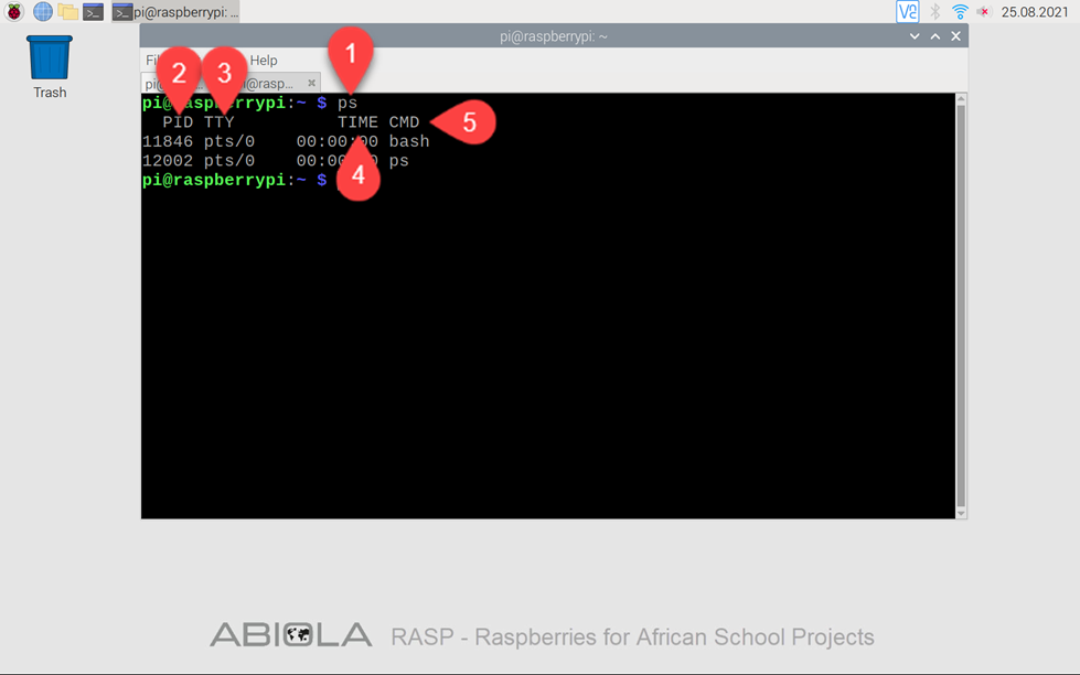- Gib dazu den Befehl ps ein, um die aktuell laufenden Prozesse anzuzeigen.