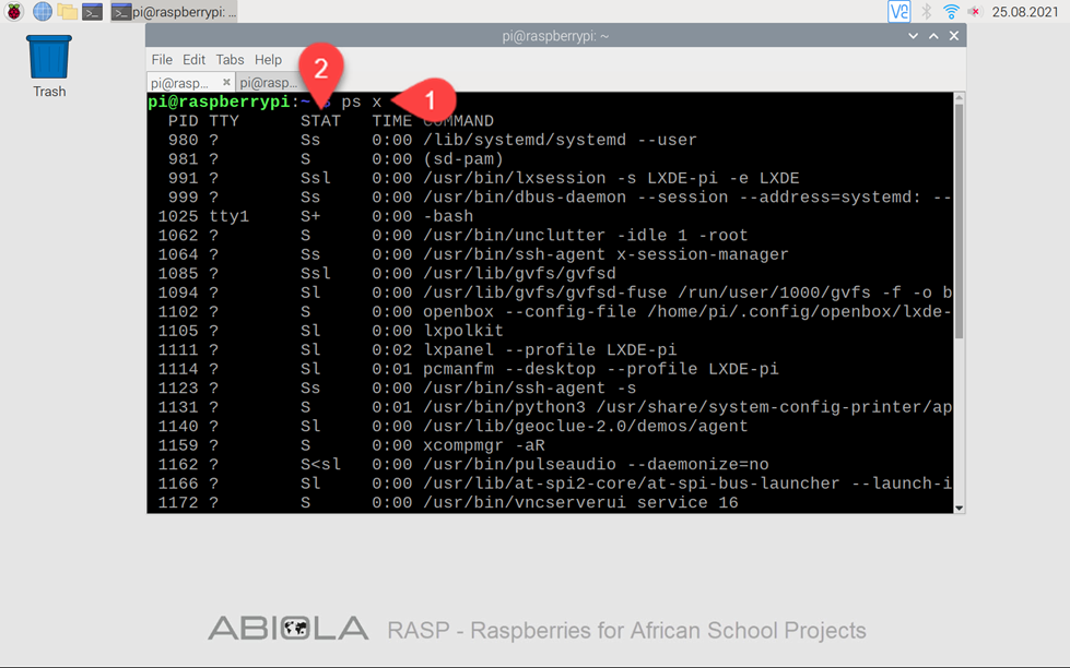 Der Zusatz x weist ps an, alle Prozesse anzuzeigen, unabhängig davon, von welchem Terminal sie gesteuert werden. Hier ein Beispiel dazu: