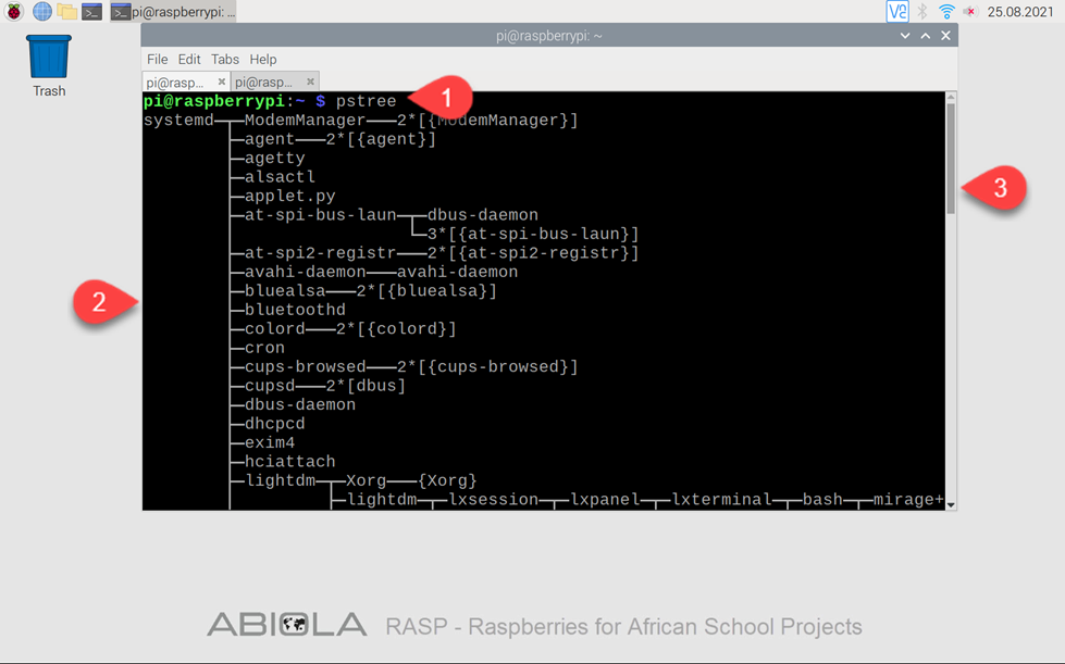 Der Befehl pstree ähnelt dem Befehl ps, aber anstatt die laufenden Prozesse aufzulisten, werden sie in einer Struktur angezeigt. Die Ausgabe in Form eines Baumdiagramms ist eine alternative Möglichkeit, die Prozesshierarchie einzusehen und macht das Ganze häufig deutlich übersichtlicher.