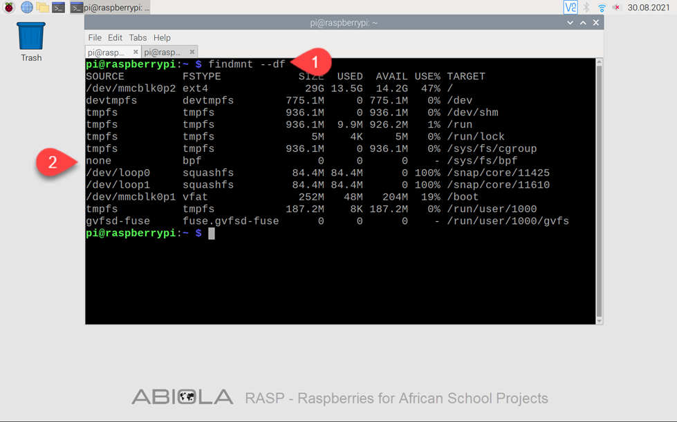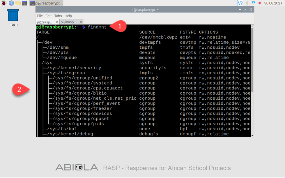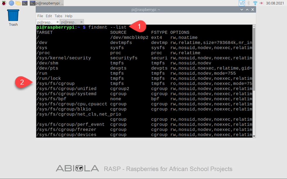 Der Befehl findmnt wird verwendet, um eine Liste der bereitgestellten Dateisysteme (engl: “mounted file systems”) anzuzeigen. Hier gibt es verschiedene Möglichkeiten, die “gemountete” Datei anzuzeigen, wenn wir den Befehl findmntverwenden. Ein Beispiel:
