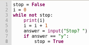 Es ist möglich if Bedingungen und while Schleifen zu kombinieren. Dabei muss nur auf die Einrückung geachtet werden, jede Verschachtelung benötigt eine weitere Einrückung. Als Beispiel hier ein Programm das immer weiter Zahlen ausgibt bis der nutzer einmal auf die Frage “Stop?” mit “y” antwortet.