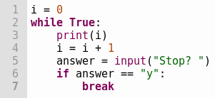 Im letzten Topic haben wir gesehen wie wir eine Schleife von innen mit Hilfe eines if Steuern können. Dafür brauchten wir eine extra Variable. Da dieses Muster, eine Schleife durch ein if in der Schleife beenden zu wollen, häufig auftritt gibt es dafür break. Mit break können wir eine Schleife beenden.