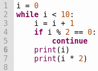 stop variable aber dafür mit breakEin ähnlicher Baustein den wir benutzen können um Schleifen zu steuern ist continue. Während break die Schleife ganz abbricht überspringt continue nur einen Durchlauf der Schleife. Zum Beispiel hier ein Programm, das jede Zahl von einschließlich 1 bis ausschließlich 10 und dazu immer ihr doppeltes ausgibt. Dabei wird jede gerade Zahl übersprungen.