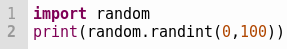 random Module importiert und danach wird die randint Funktion aus random aufgerufen.Nach dem wir mit Hilfe von import random das random Modul importiert haben, können wir Funktionen aus diesem Modul aufrufen. Hier rufen wir die randint Funktion des random Modules mit random.randint auf. Der Aufruf im Beispiel generiert eine Zahl von einschließlich 0 bis einschließlich 100 und gibt diese Zufällige Zahl aus.