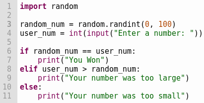 Aufgabe: Entferne die “You Lose” ausgabe und ersetze sie durch eine Ausgabe ob die geratene Zahl zu groß oder zu klein war. Wenn die geratene Zahl zu groß war gebe “Your number was too large” aus. Falls die geratene Zahl zu klein war gebe “Your number was too small” aus. Die Lösung findest du weiter unten.