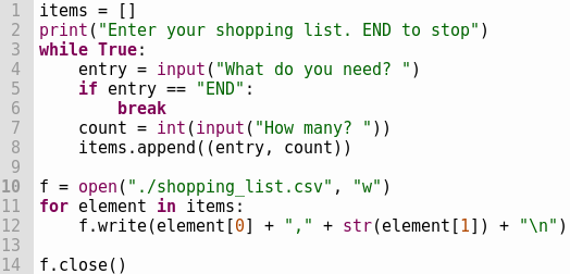 Wir verwenden hier das csv Format zum abspeichern unserer Daten, csv steht für “comma seperated values” oder manchmal auch “character seperated values” also Werte die durch ein trennzeichen wie zum beispiel ein Komma getrennt sind. Das Format ist sehr beliebt um tabelarische Daten auszutauschen oder abzuspeichern. Es ist durch diese Speicher art leider auch nicht möglich ein Komma im Namen eines Eintrags unserer Shopping Liste zu haben.